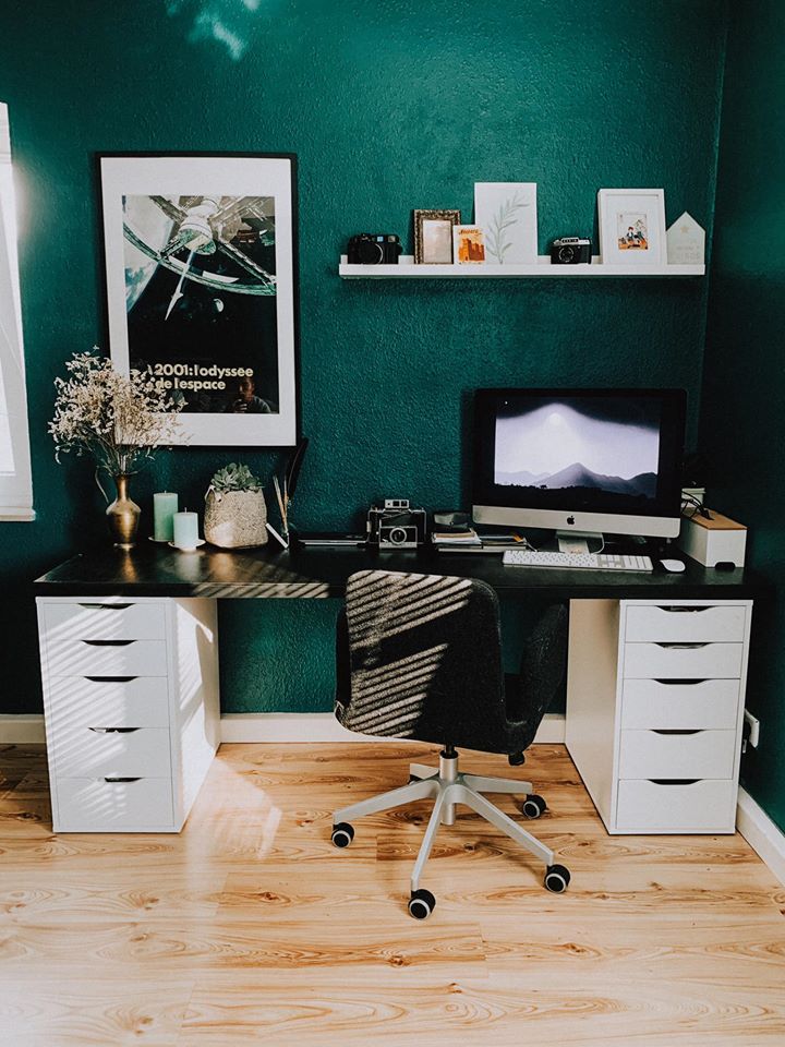 Bàn làm việc cũng được Thu Thủy sơn lại để hài hòa với không gian xung quanh. Cô không quên treo những bức tranh với kích cỡ khác nhau để tăng thêm sự sinh động.