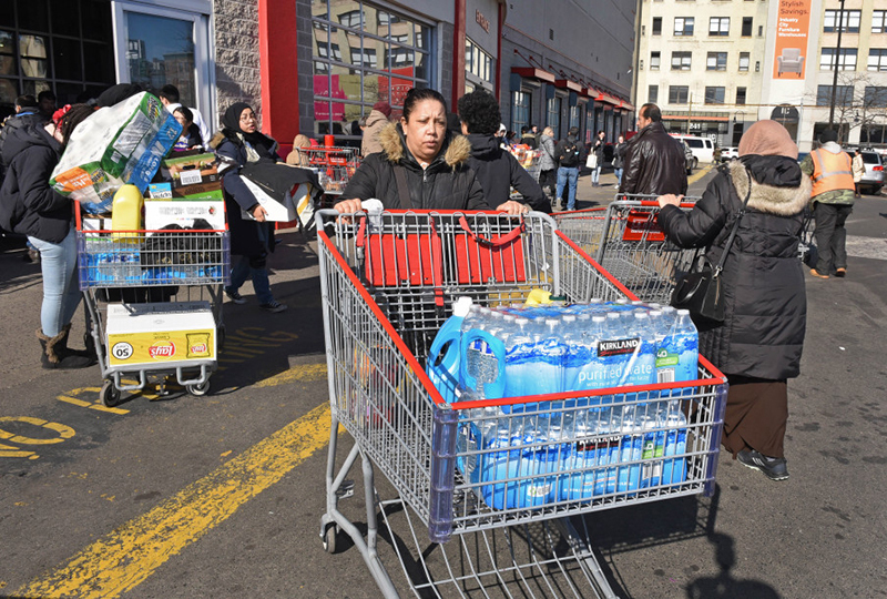 Tại siêu thị ở quận Brooklyn hôm 1/3, hàng trăm người, trong đó nhiều người không đeo khẩu trang, hối hả mua nước đóng chai, gạo và các đồ dùng gia đình. Các nhân viên siêu thị cho biết họ phải bổ sung nước khoáng lên kệ hàng liên tục. "Covid-19 đã khiến họ hoảng sợ. Họ nghĩ tận thế sắp đến", Jerry, quản lý siêu thị, nói. "Dù sao thì điều đó rất tốt cho việc kinh doanh", anh nói thêm, dự kiến siêu thị đạt doanh thu hơn một triệu USD trong ngày. Ảnh: NY Post.