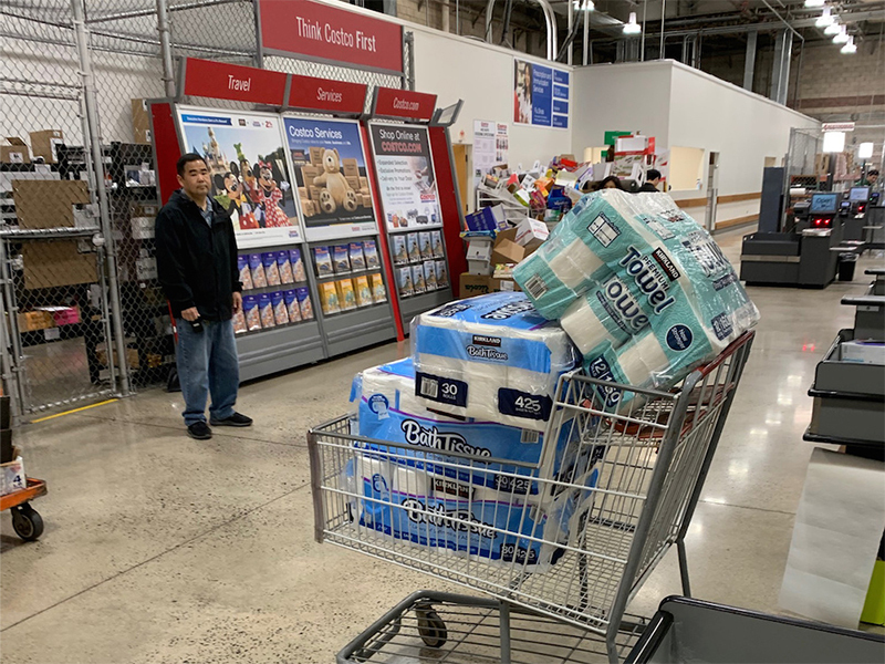 Ông Duane Tanouye, một người có mặt tại Costco hôm đó, cho biết có đến 200 người xếp hàng bên ngoài siêu thị. Mỗi khách hàng chỉ được mua những sản phẩm thiết yếu như giấy vệ sinh với số lượng nhất định. Tuy nhiên, nhiều người vẫn chất đầy những sản phẩm này trên xe đẩy. Ảnh: Reuters.