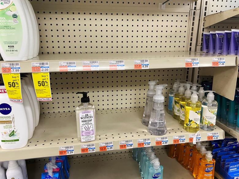 Nước rửa tay là một trong những mặt hàng được săn lùng nhiều nhất. Một nhân viên của chuỗi cửa hàng dược phẩm Duane Reade ở Manhattan cho biết đã nhập lượng nước rửa tay gấp ba lần so với trước đây nhưng vẫn không đủ hàng để bán. Ảnh: Reuters.