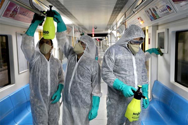 Các nhân viên mặc đồ bảo hộ đang tiến hành khử trùng cho các tàu điện ngầm ở thủ đô Tehran, Iran. Ảnh: AP