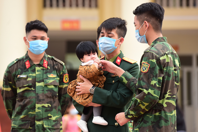 Em bé 7 tháng tuổi, con gái chị Nguyễn Thị Bình (quê Nghệ An) được bộ đội bế để mẹ cất hành lý lên xe.