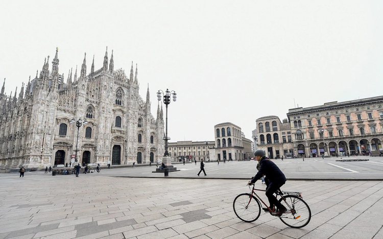 Một người dân Italy đạp xe ở khu vực vắng vẻ tại quảng trường Duomo, Milan, Italy. Ảnh: Reuters.