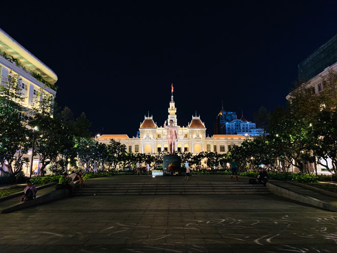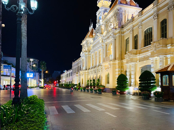 Đường Lê Thánh Tôn, đoạn tới ngã ba giao đường Nguyễn Huệ, trước cổng tòa UBND TP.HCM xe cộ thưa thớt, vắng bóng người qua lại