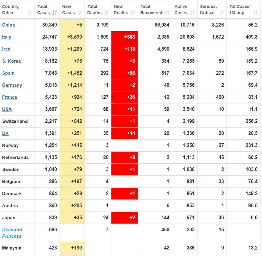 Số người nhiễm Covid-19 tại các nước châu Âu tăng nhanh, số người mắc bệnh cao nhất ngoài Trung Quốc. (Nguồn: Worldometers)