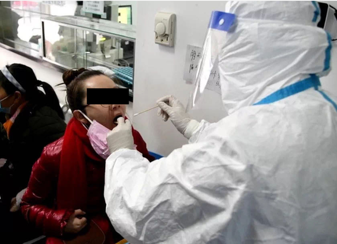 Nhân viên y tế tại Bệnh viện Hiệp Hòa, Vũ Hán dùng que gạc lấy mẫu dịch ở họng của bệnh nhân để xét nghiệm virus Corona mới (Ảnh: Guancha).