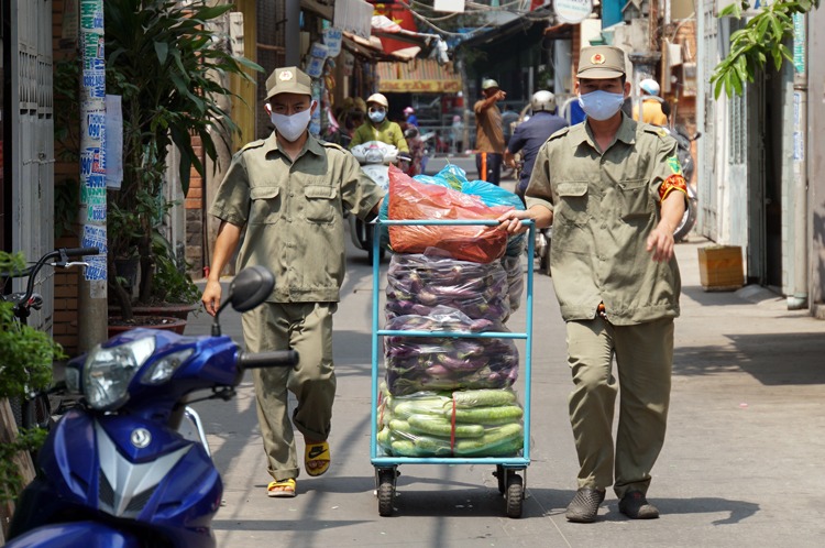 Dân phòng đưa thực phẩm vào cho các hộ dân bị cách ly ở phường 1, quận 8, sáng 23/3. Ảnh: Mạnh Tùng.