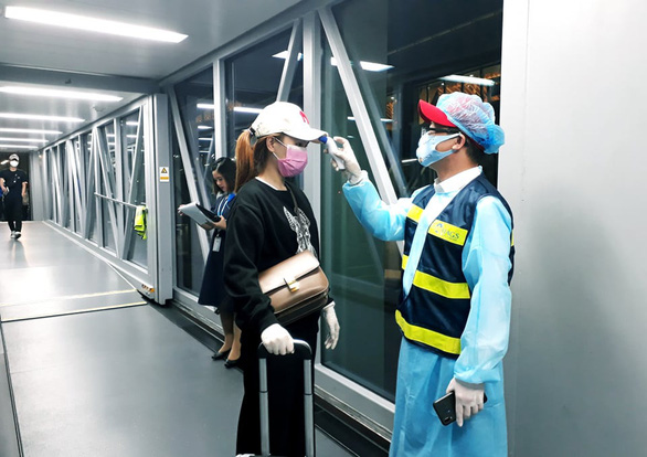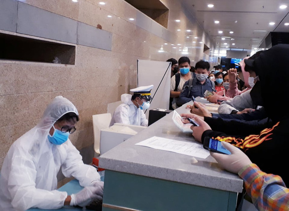 Các hành khách thực hiện khai báo y tế tại sân bay Cần Thơ trước khi lên xe về khu cách ly 14 ngày ở tỉnh Hậu Giang