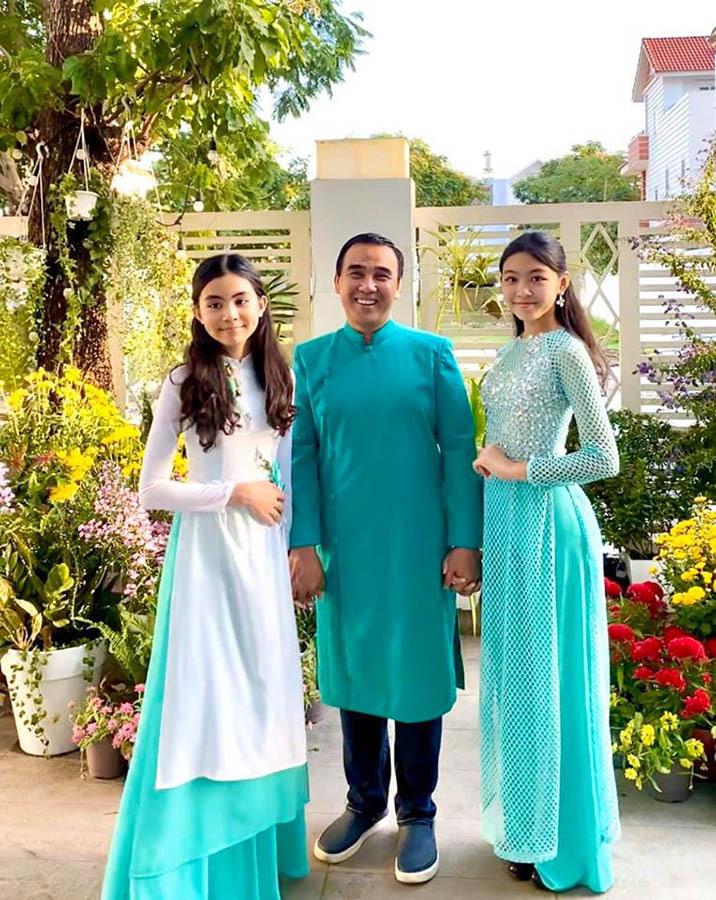 Quyền Linh và 2 con gái đứng chụp ảnh bên nhiều cây hoa trước sảnh nhà.