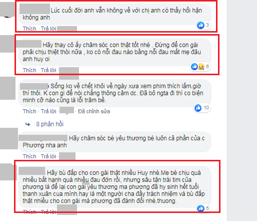 Nhiều cư dân mạng cũng để lại những bình luận đề cập đến mối quan hệ riêng tư của Mai Phương và bạn trai cũ. "Hãy bù đắp cho con gái thật nhiều Huy nhé! Mẹ bé chịu quá nhiều bất hạnh quá nhiều đau đớn rồi, nhưng sâu tận trái tim của Phương là để lại con gái yêu thương mà Phương đã hy sinh hết tuổi thanh xuân của mình. Hãy là một người cha đầy trách nhiệm và bù đắp thật nhiều cho con gái mà Phương đã đánh đổi nhé! Thương!", Facebooker L.D bày tỏ.