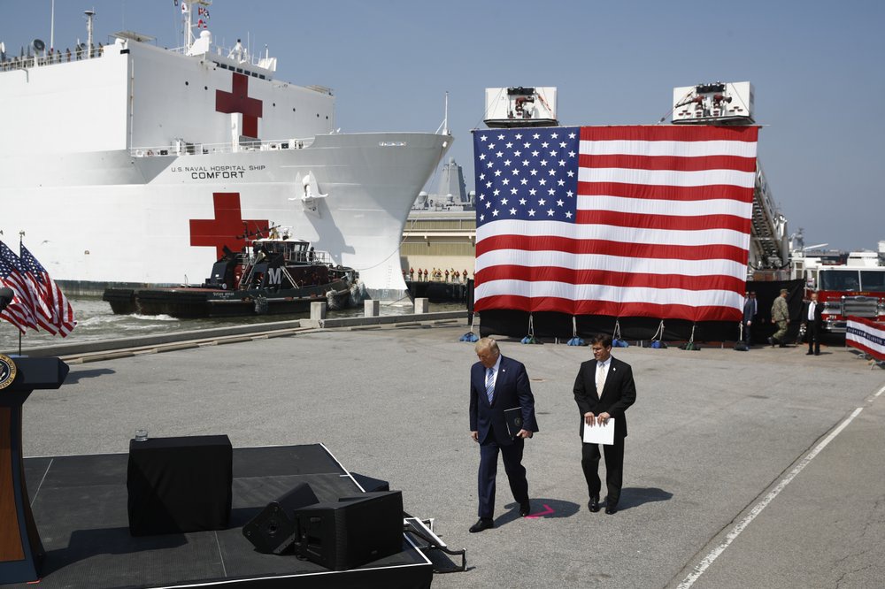 Tàu bệnh viện USNS Mercy chuẩn bị rời cảng ở Virginia để đến New York hôm 28/3. Tổng thống Donald Trump và Bộ trưởng Quốc phòng Mark Esper có mặt trong lễ tiễn. Ảnh: AP.