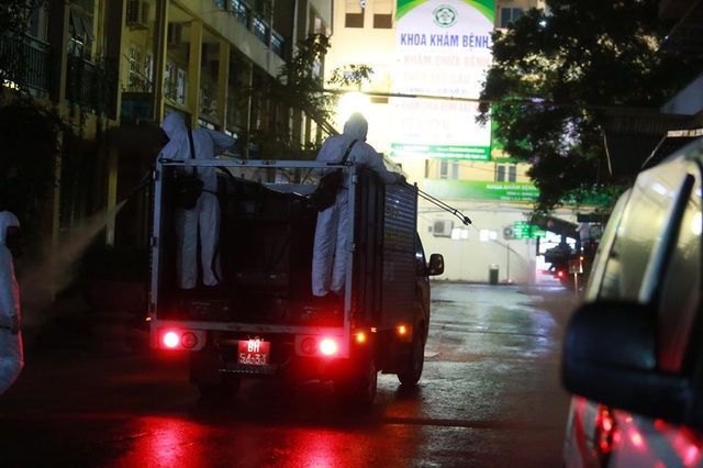 Binh chủng Hóa học phun khử trùng, tiêu độc tại Bệnh viện Bạch Mai. (Ảnh: Nguyễn Dương)