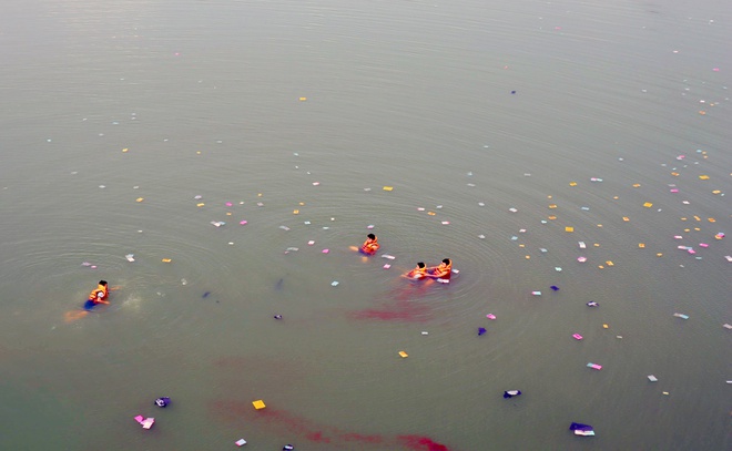 Lực lượng cứu hộ lặn tìm người nhảy cầu Nha Bích. Ảnh: L.Ngân.