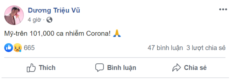 Giống như nhiều người, Dương Triệu Vũ hết sức quan ngại về dịch bệnh đang diễn biến phức tạp. Việc anh đăng tải dòng trạng thái có đề cập đến số ca nhiễm tăng nhanh tại Mỹ có thể chỉ là tâm lý lo lắng trước vấn nạn không chỉ của riêng ai.