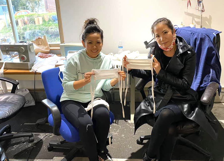 Chị Thảo Phạm (trái), thợ nail ở Tacoma, cùng với chị Kati và nhóm thiện nguyện, may tặng hơn 2,000 khẩu trang cho nhân viên y tế ở các bệnh viện tại Tacoma, Washington. (Hình: Thảo Phạm)