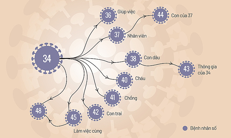 Bệnh nhân 45, 48 lây nhiễm trực tiếp từ "bệnh nhân 34" Đặng Thị Lynh Trang, nữ doanh nhân tại Bình Thuận. Bệnh nhân 65 lây gián tiếp từ 34 (F2).