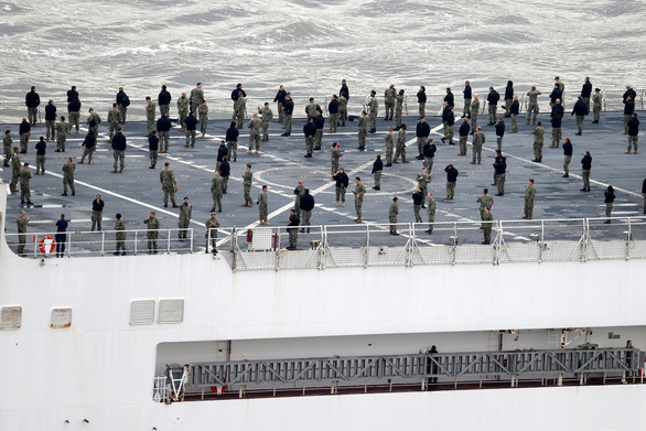 Quân nhân trên tàu Comfort giữ khoảng cách với nhau - Ảnh: REUTERS