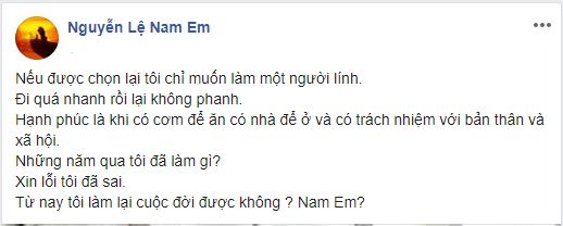 Nam Em buồn bã viết: “Nếu được chọn lại, tôi chỉ muốn làm một người lính. Đi quá nhanh rồi lại không phanh. Hạnh phúc là khi có cơm để ăn, có nhà để ở và có trách nhiệm với bản thân và xã hội. Những năm qua tôi đã làm gì? Xin lỗi, tôi đã sai. Từ nay, tôi làm lại cuộc đời được không? Nam Em?”.