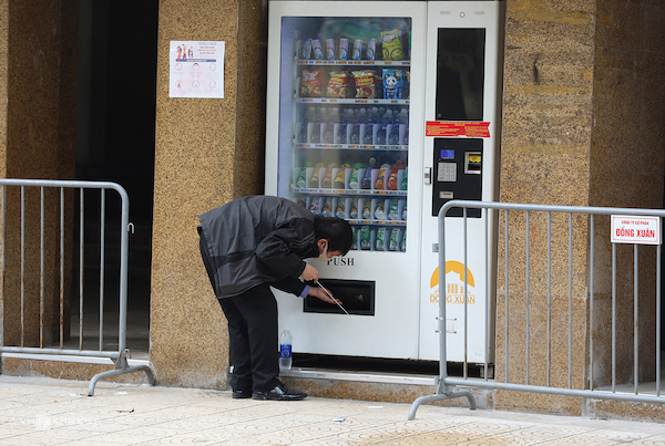Trên hè chợ Đồng Xuân, người đàn ông dùng chiếc gậy để nhặt những chai nước mua trên máy tự động.