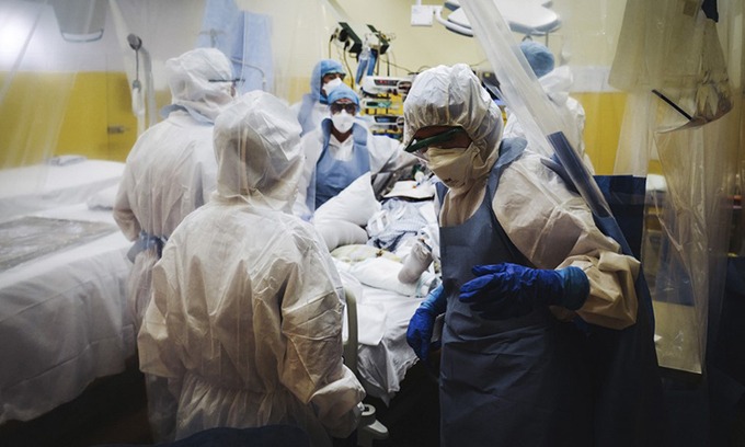 Các nhân viên y tế điều trị cho bệnh nhân Covid-19 trong phòng chăm sóc tích cực tại bệnh viện Franco-Britannique, phía bắc Paris, Pháp hôm 9/4. Ảnh: AFP.