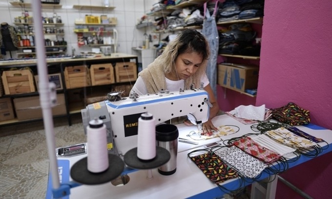 Thợ may may khẩu trang tại Belo Horizonte, Brazil ngày 8/4. Ảnh: AFP.