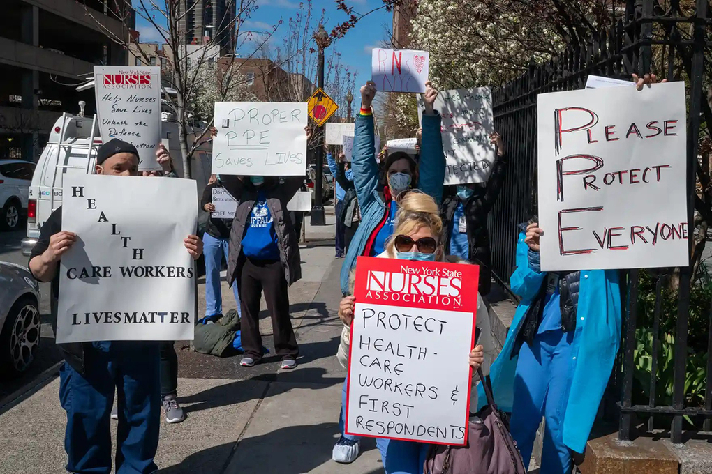 Nhân viên y tế cầm bảng biểu t́nh, phản đối t́nh trạng thiếu hụt trang thiết bị bảo hộ ở bệnh Montefiore, Bronx. Ảnh: David Dee Delgado/Bloomberg.