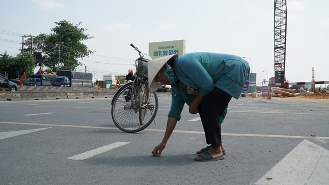 Sáng 16.4, PV Thanh Niên theo chân bà Tư đi nhặt đinh trên QL1 trước cổng BXMĐ mới. Đoạn đường này vừa mới được mở rộng, trải nhựa nên nhiều xe máy đi hướng từ TP.HCM về Đồng Nai chạy nhanh. Có nhiều miếng sắt được cắt hình thoi rải trong làn xe máy. Bà Tư phải dừng xe đạp giữa đường để báo hiệu cho xe máy biết tránh tông mình rồi xuống xe, nhặt từng chiếc đinh tự chế. Đi bộ một đoạn gần 300 m, bà Tư đã nhặt gần 50 chiếc đinh. Theo bà Tư: “Mỗi ngày, tôi nhặt đinh 4 lần tại khu vực này vào sáng sớm, giữa buổi sáng, đầu giờ chiều và chiều tối. Nhưng tôi nhặt xong thì lại có người rải để bẫy người đi xe máy”.
