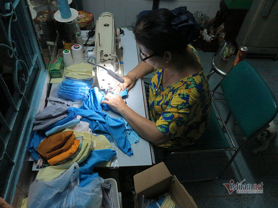 Chồng bà Thu Mì là thương binh, nghe không rõ. Thấy vợ cả ngày cặm cụi với mấy chiếc khẩu trang cũng ngồi vào phụ. ‘Đang ăn cơm, nhìn chiếc khẩu trang bị hư, bà ấy bỏ chén, ngồi sửa. Ngủ cũng giấc được giấc mất vì chiếc khẩu trang. May không được, bà ấy khó chịu, bực bội’, chồng bà Thu Mì kể.