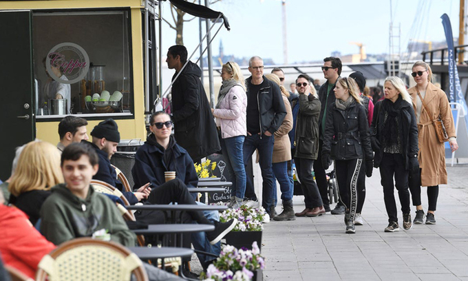 Một quán cà phê ở thủ đô Stockholm vẫn đông khách hôm 20/4. Ảnh: Reuters.