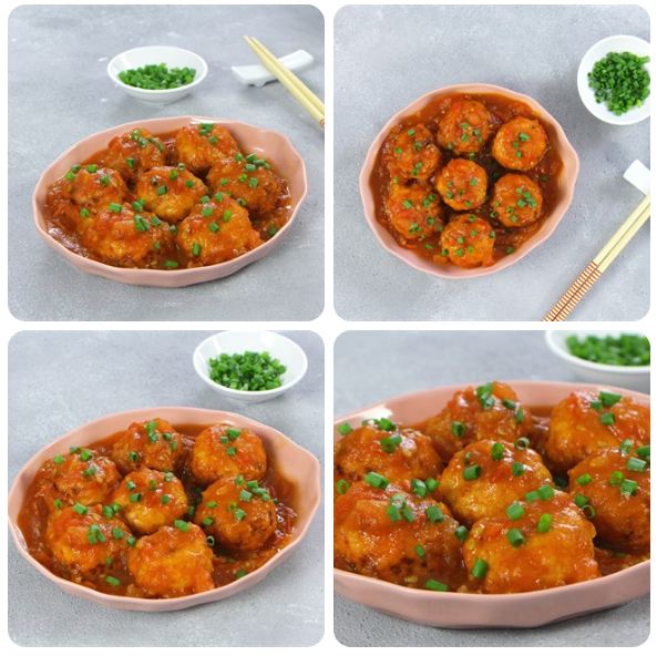 Trình bày món ăn ra dĩa, rắc thêm ít hành lá cắt nhỏ cho món ăn thêm phần hấp dẫn hơn. Gà viên sốt cà ăn cùng cơm nóng thì còn gì bằng, cùng vào bếp và thực hiện ngay món ăn này thôi!
