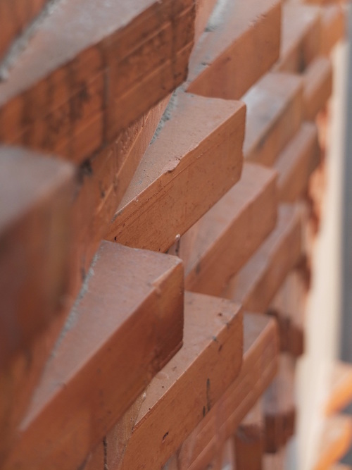 Cách xếp gạch chéo khiến thời gian thi công tăng gấp đôi nhưng đem tới nhiều công dụng. Ngoài mục đích gợi hình ảnh kênh Nhiêu Lộc và tạo cá tính cho công trình, mặt tiền hạn chế được bức xạ nhiệt và tăng khả năng cách âm cho bên trong nhà.