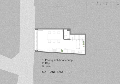 Phần đất xây nhà không vuông vức mà có một khoảng méo đằng sau. Để công trình thoáng và nhiều sáng hơn, kiến trúc sư biến khoảng không gian này thành cầu thang kết hợp thông tầng.