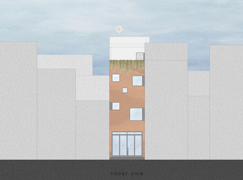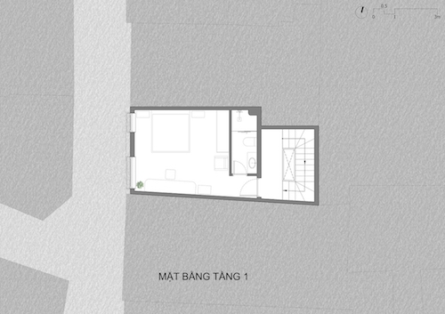 Công trình nằm trong một con hẻm rộng 2,5 m gần kênh Nhiêu Lộc là nơi ở của một phụ nữ trẻ. Yêu cầu đặt ra là tiết kiệm chi phí, tiện dụng và có diện mạo nổi bật. Để đáp ứng mong muốn của gia chủ, các kiến trúc sư đưa ra thiết kế với mặt tiền gạch nung xếp chéo.