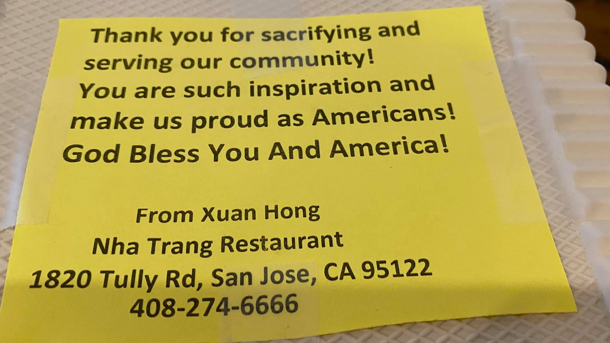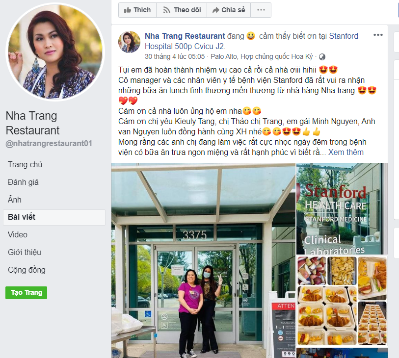 Nhà hàng Việt tài trợ hàng trăm suất ăn giúp các bác sĩ California, Mỹ chống COVID-19. Đó là quán ăn Việt Nam mang tên Nha Trang Restaurant tại San Jose (California, Mỹ). Họ đã tài trợ hàng trăm suất ăn ngon mắt và bổ dưỡng giúp bác sĩ tại các bệnh viện trong thành phố chống dịch COVID-19. Những tấm lòng vàng của người Việt tại đây được trân trọng.