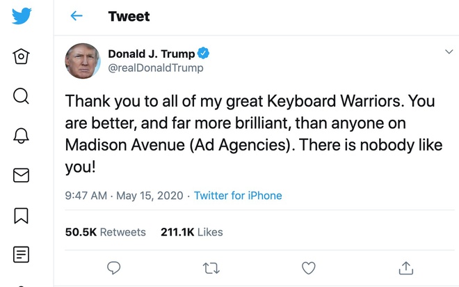 Trên Twitter, Tổng thống Mỹ Donald Trump gửi lời cảm ơn tới "các chiến binh bàn phím vĩ đại" và cho rằng những người ủng hộ ông trên mạng còn xuất sắc hơn ngành quảng cáo.