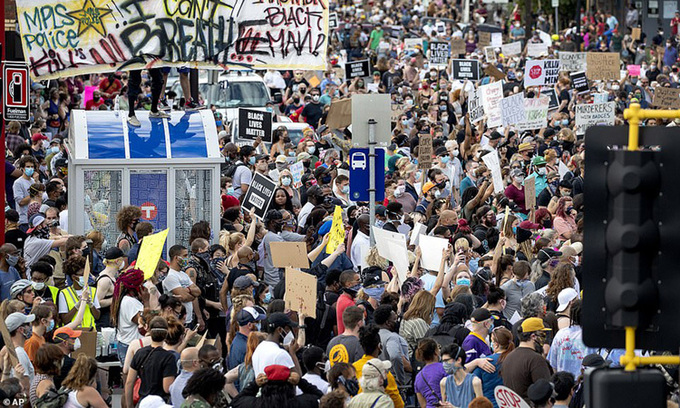 Hàng trăm người ở Minneapolis tối 26/5 mang theo các biểu ngữ "Tôi không thể thở được" và "Công lý cho Floyd" để biểu tình sau cái chết của người đàn ông da màu George Floyd, 46 tuổi. Người biểu tình bao vây đồn cảnh sát, một số người đập vỡ cửa sổ và ném gạch đá.