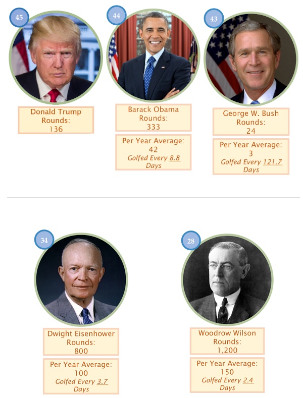 Cho đến nay theo những thông tin thì Trump đả chơi 209 lần .. và nếu Trump được làm TT cho nhiệm kỳ 2 thì chắc con số sẻ vượt trội hơn Obama ... Hahaha.. vì Trump lúc nào cũng muốn hơn Obama ?