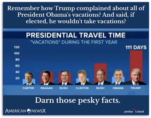 Theo lời Trump biện luận thì Obama cũng đả chơi golf trong mùa dịch H1N1 khi quốc gia đang có chuyện Emergency ... Và Trump đả từng nói trên 52 ngày Tao chưa đụng vô golf .. ngứa ngáy tay chân quá .. bây giờ Tao cứ chơi .. ai chửi thì mặc kệ ... Hahaha...