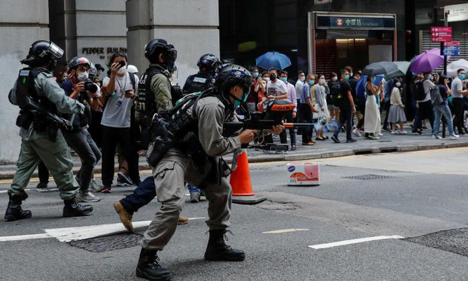 Cảnh sát chống bạo động kiểm soát biểu t́nh tại Hong Kong hôm 27/5. Ảnh: Reuters.