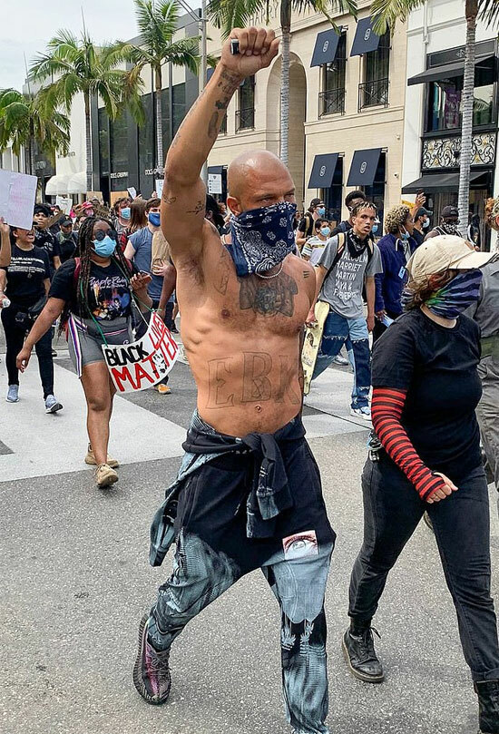 Người mẫu Jeremy Meeks cởi trần, giơ tay và hô vang khẩu hiệu.