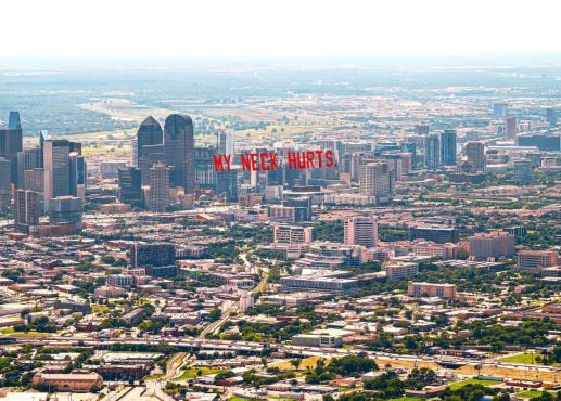 Tấm biểu ngữ "Mỹ neck hurts" (Cổ tôi bị đau) trên bầu trời thành phố Dallas. Ảnh: Jammie Holmes