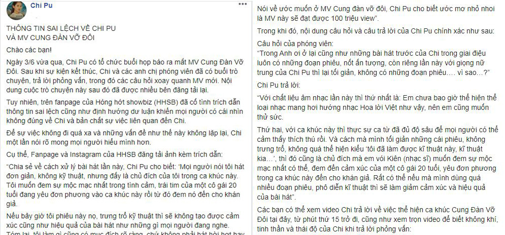 Chi Pu chia sẻ: "Bản thân Chi luôn biết mình còn phải cải thiện rất nhiều để trở nên giỏi hơn, tốt hơn từng ngày. Chính vì vậy, Chi đã cố gắng rất nhiều, luôn dốc hết sức lực, tâm huyết vào từng sản phẩm với mong muốn một ngày nào đó, sẽ được nhiều hơn nữa những khán giả yêu quý và công nhận. Nhưng, Chi cảm thấy rất tức giận, mệt mỏi và uất ức khi càng cố gắng bao nhiêu thì những thông tin sai lệch tiêu cực từ họ và từ trên mạng lại đạp đổ tất cả, làm cho hình ảnh của Chi trở nên xấu xí trong mắt khán giả".