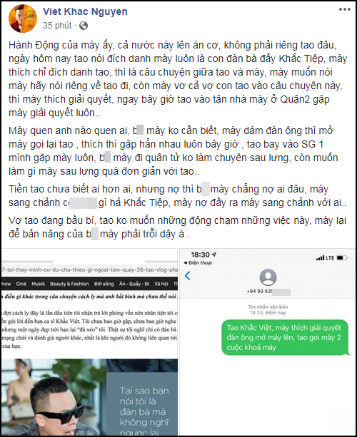 Nguyên văn chia sẻ của Khắc Việt: "Hành động của mày ấy, cả nước lên án cơ không phải riêng tao đâu. Ngày hôm nay tao nói đích danh mày luôn là con đàn bà đấy Khắc Tiệp. Mày thích chỉ đích danh tao, thì là câu chuyện giữa tao và mày. Mày muốn nói, hãy nói riêng về tao đi, còn vơ cả vợ con tao vào câu chuyện này. Mày thích giải quyết, ngay bây giờ tao vào tận nhà mày ở Quận 2 gặp mày giải quyết luôn.