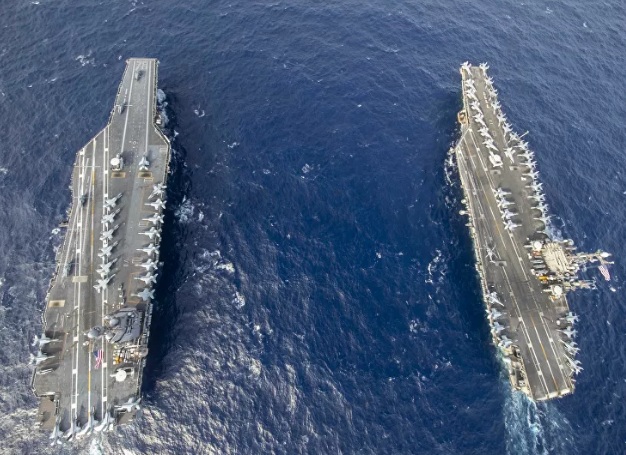 Tàu sân bay USS Gerarld R. Ford (trái) và tàu sân bay USS Harry Truman trong lần ra khơi mới nhất.
