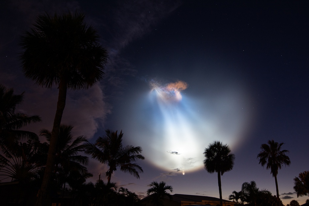 Ở đoạn cuối khi tên lửa đã lên tới quỹ đạo và con tàu chứa vệ tinh được phóng đi, ánh sáng phản chiếu qua bầu trời tạo thành một vùng sáng rộng và có thể nhìn thấy từ cách đó hàng trăm km. Ảnh: Marcus Cote.