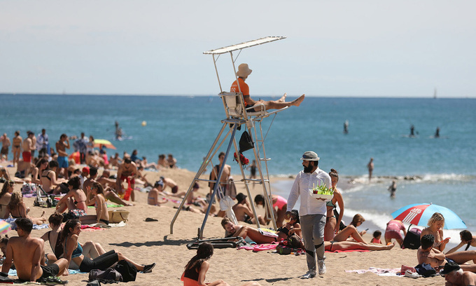 Người dân tận hưởng ánh nắng tại bãi biển Barceloneta, thành phố Barcelona, Tây Ban Nha, hôm 13/6. Ảnh: Reuters.
