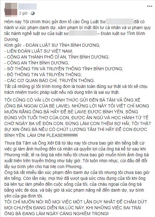 Bảo mẫu của bé Lavie thể hiện sự bức xúc trước những hành động của ông bà bé: 'Ông bà hãy để bé Lavie được bình yên, sống đúng với tuổi thơ của con, được ăn ngủ và học hành tử tế chờ ngày ba về đón con. Đừng làm con thêm sợ hãi.Tôi thật sự xin ông bà nếu có chút lương tâm thì hãy để con được bình yên. Làm ơn!'.