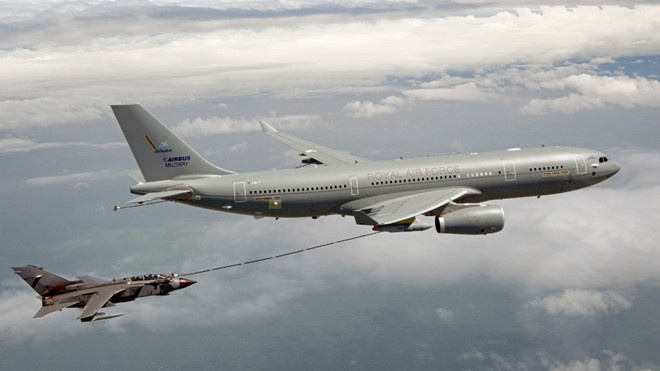 Máy bay Voyager đang tiếp nhiên liệu trên không cho một chiếc máy bay Tornado. Ảnh: RAF.