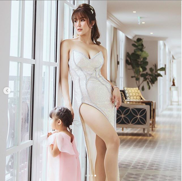 Diệp Lâm Anh gây sự chú ý khi diện váy cúp ngực được thiết kế xẻ đùi cao "bất tận". Bà mẹ hai con tạo dáng bên con khiến fan trầm trồ vì vóc dáng chuẩn đồng hồ cát, không chút mỡ thừa.