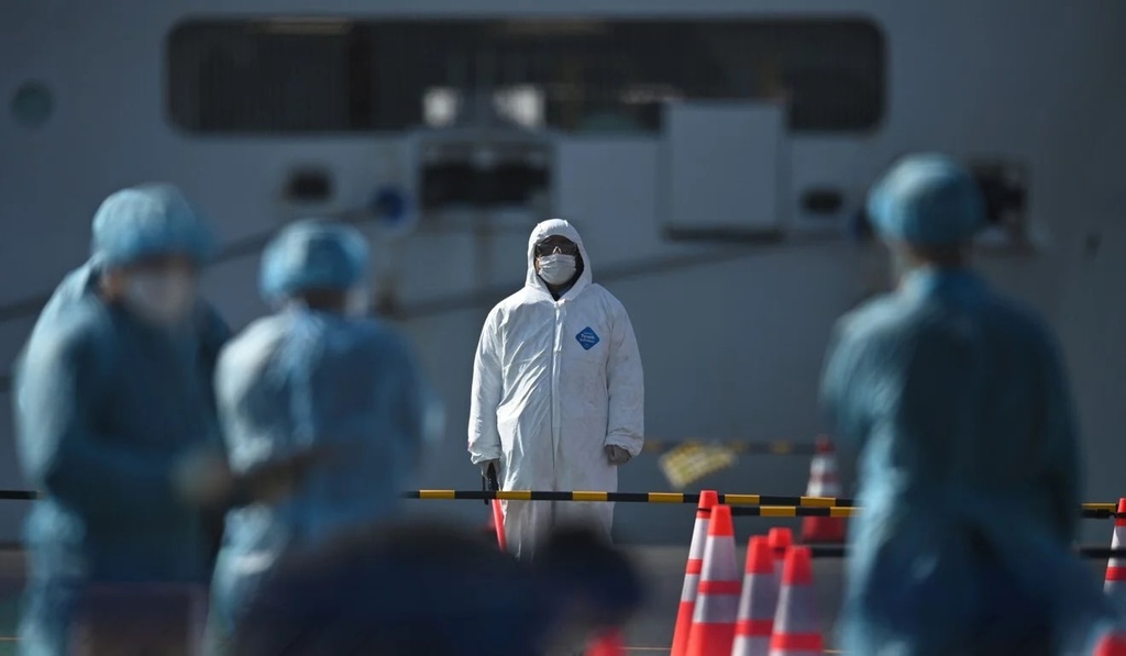 Công nhân mặc quần áo bảo hộ chuẩn bị trước khi hành khách rời du thuyền Diamond Princess, bị cách ly ở Nhật Bản vào tháng 2 do lo ngại Covid-19. Ảnh: AFP."Không có tin vui cho thuyền viên Trung Quốc"